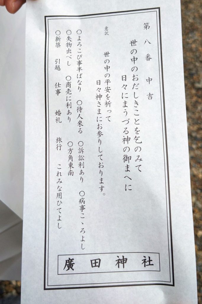 お参り、破魔矢購入後、おみくじチャレンジ! 昨年は「大吉」だったので期待しましたが、「中吉」という微妙な結果に。「よろこび事半ばなり」が気になるところ。