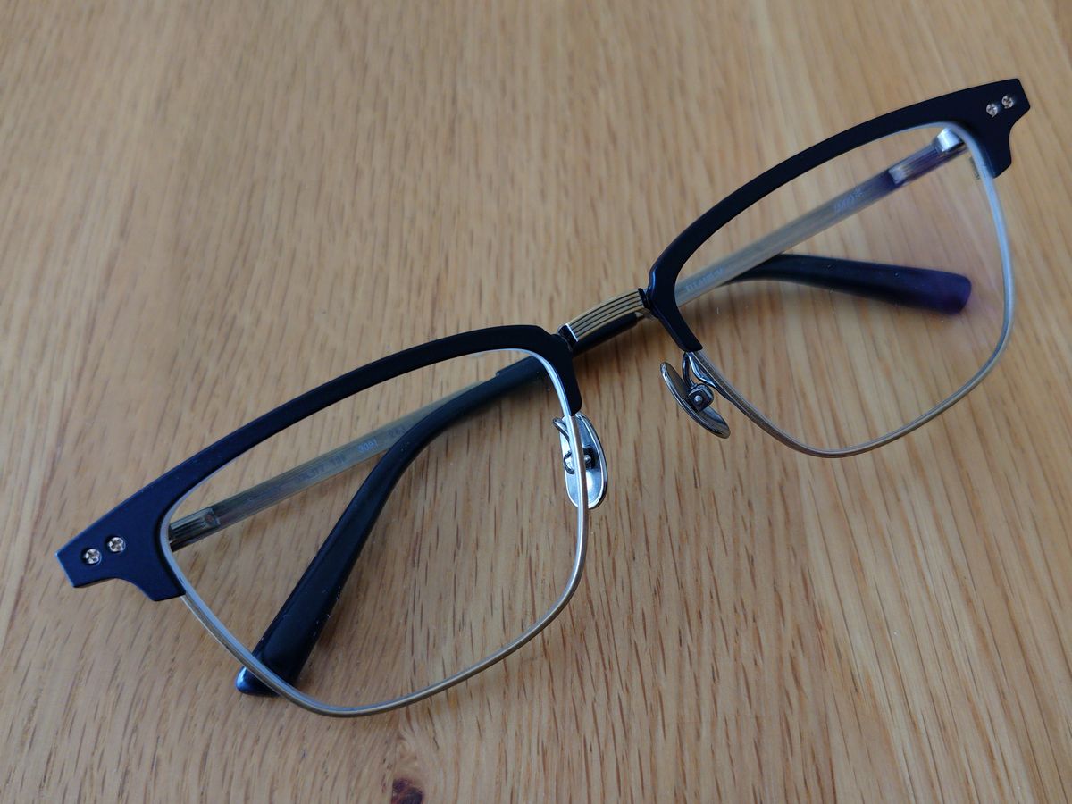 「前回より軽いフレームがいいな」ということでチタンフレームを軸に試着。色々試した結果、このフレームにしました。人生初めてのゴールドが入ったフレーム(画像ではわかりにくいですが・・・)。こういうフレームを選択する年齢になったということか?