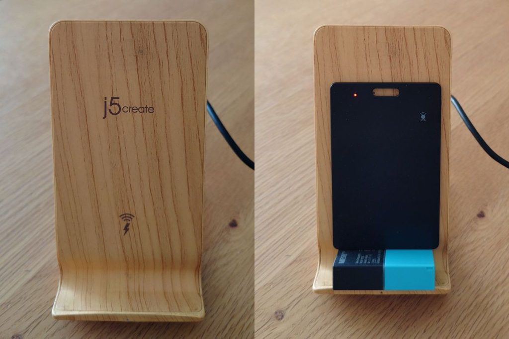 このスマートタグは、ワイヤレス充電方式、使い捨てでないのが嬉しい。以前ワイヤレス充電のスマホを使っていたときのスタンドを活用。取っておいて良かったなぁ~